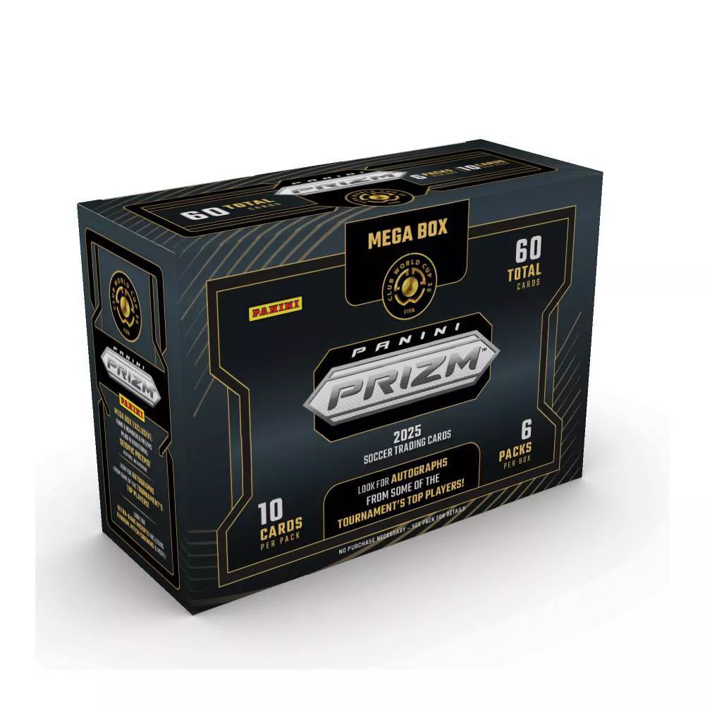 Panini presents the 2025 FIFA Prizm Soccer Trading Card Mega Box. Each box contains 6 packs with 10 cards per pack. Look for Autographs from some of the Tournament's Top Players! Look for Mega Box Exclusives like finding 2 Numbered Prizms plus 8 additional Seismic Prizms, per box, on average. Look for Ultra-Rare Inserts including Kaboom, Pitch Crowns and more! Content may vary. Collect them all!